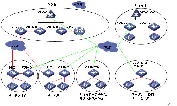省水利設(shè)計(jì)院已經(jīng)部署了200門容量的PBX,采用語音網(wǎng)關(guān)將PBX及其下掛的模擬電話接入系統(tǒng)后,除了不需要連接水利部語音系統(tǒng)外,其組網(wǎng)與省防總完全一致,與省水利設(shè)計(jì)院連接的PBX可采用VG80-20,使用2個E1連接。