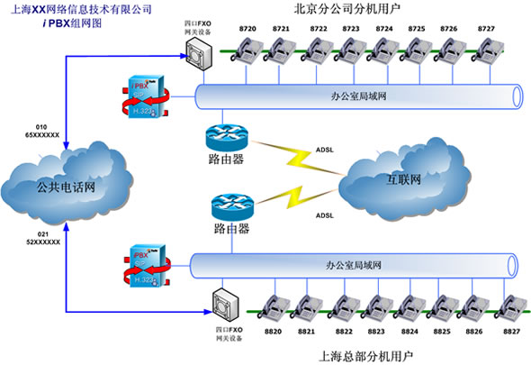 根據該用戶解決內部通訊費用的要求,在北京和上海兩個iPBX系統(tǒng)之間實現互通。兩套iPBX的外線通過普通模擬網關的FXO口與現存的PSTN線連接。