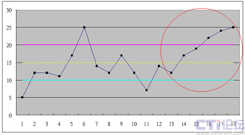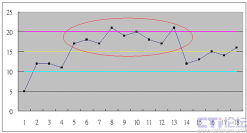 12就是數(shù)據(jù)有12個點,像是鋸齒一樣,在均值上下連續(xù)跳動(六西格瑪用到了14個點,我認(rèn)為呼叫中心觀察到12個點就應(yīng)該可以確認(rèn)有特殊原因了)。