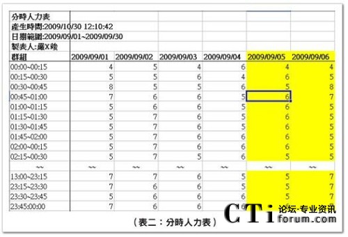 分時人力表在管理上有重要的地位,用于檢視時間內(nèi)排定的出席人數(shù),通常是將此數(shù)據(jù)與預(yù)測的話務(wù)需求做比對,檢查排定人力數(shù)與話務(wù)曲線的擬合度。在現(xiàn)場管理時,則用于小休調(diào)度,避免小休人數(shù)過多,使出席人數(shù)降到關(guān)鍵少數(shù)的臨界點下,造成服務(wù)水平大幅跌落的狀況發(fā)生。