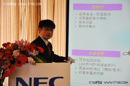 2011年3月28日,國際通信行業(yè)巨頭日本電氣株式會(huì)社(以下簡稱NEC公司)在北京舉辦新品發(fā)布會(huì),宣布最新智能通訊服務(wù)器SL1000正式上市。發(fā)布會(huì)上,NEC公司IT網(wǎng)絡(luò)國際解決方案組平臺(tái)事業(yè)部副總裁橋沢太一郎先生闡述了對(duì)未來中國市場的市場策略和遠(yuǎn)景目標(biāo)。