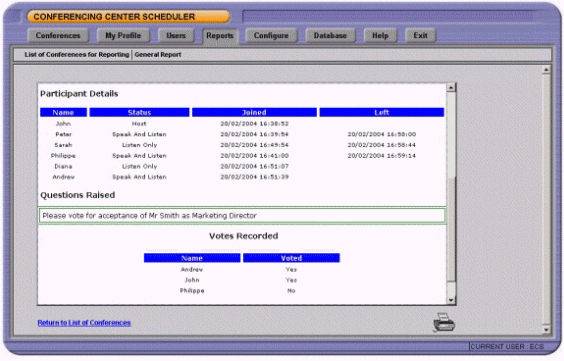管理員可以生成會議使用率和每個會議的報告。消息內(nèi)容包括會議名稱,ID號,會議起始日期,會議持續(xù)時間和與會人員的數(shù)目。每個會議報告可以列出與會人員的詳細(xì)列表和他們何時進(jìn)入/離開會議。