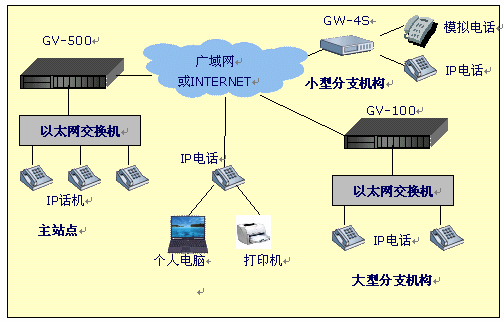- 分公司:選用一臺(tái)4口網(wǎng)關(guān)設(shè)備,接入到互聯(lián)網(wǎng)絡(luò),通過(guò)公共的IP交換中心建立起呼叫連接,實(shí)現(xiàn)打電話的功能。模擬了通過(guò)網(wǎng)關(guān)設(shè)備接入PBX(電話程控交換機(jī)),如果其它分部也要接入PBX,與此情況類似。(詳見(jiàn)后面的"撥號(hào)示例")