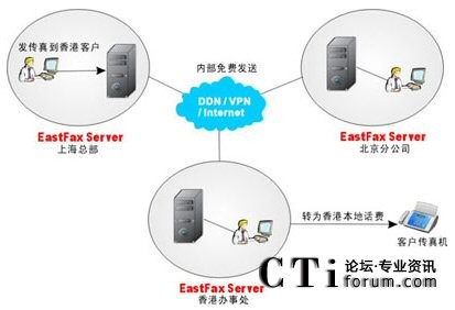 在上圖中,某集團(tuán)公司總部位于上海,在北京、香港有分支機(jī)構(gòu),與分支機(jī)構(gòu)及客戶之間經(jīng)常有大量的傳真往來。目前三個地方已通過VPN實現(xiàn)了網(wǎng)絡(luò)互通,且均安裝了EastFax傳真服務(wù)器。
