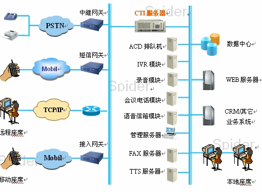 - 座席終端:座席使用的終端可以是IP電話、軟電話、手機(移動坐席)、普通電話用戶等。如果用戶原來的終端為普通電話的話,可以通過IAD即可接入到系統(tǒng)網(wǎng)絡中,因此節(jié)省了用戶的投資。