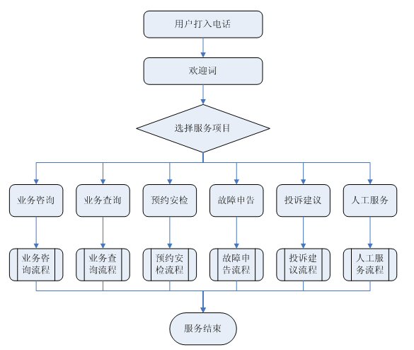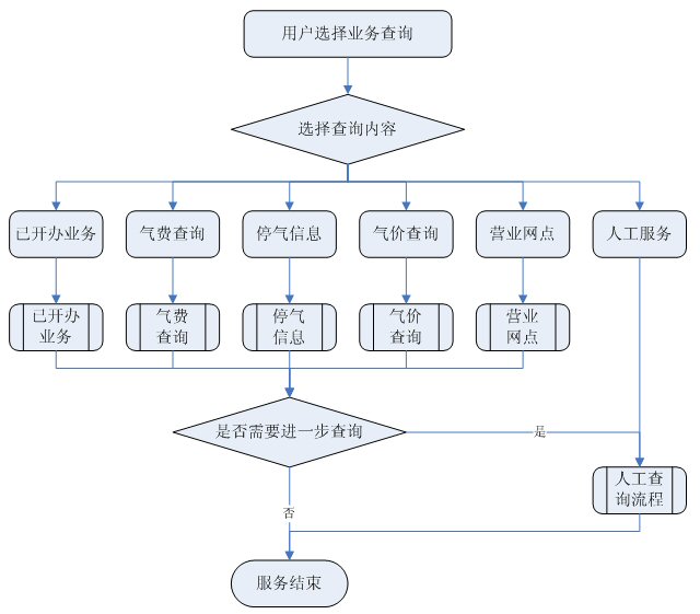 業(yè)務(wù)查詢:用戶可通過受理人員或自動(dòng)語音應(yīng)答系統(tǒng)根據(jù)用戶要求從數(shù)據(jù)庫查詢資料,然后通過語音方式播報(bào)或送到用戶指定傳真機(jī)或其他終端設(shè)備上。應(yīng)考慮以后用web方式查詢氣費(fèi)等數(shù)據(jù),以不動(dòng)及主體設(shè)備方式平滑升級(jí)。