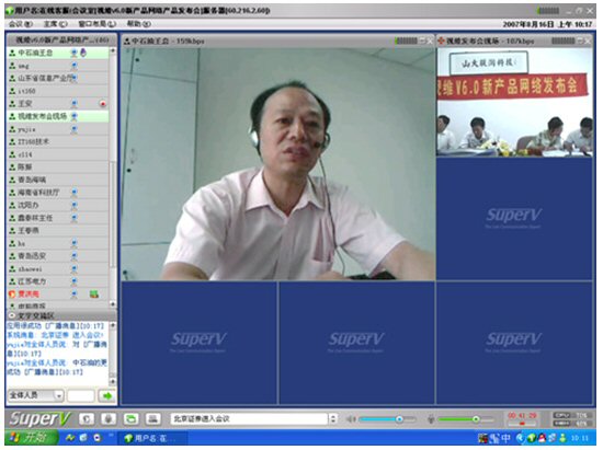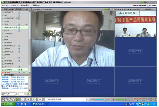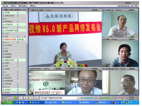 2007年8月16日,視維視頻會議V6.0新產品網絡發(fā)布會在美麗的泉城濟南舉行,山東省信息產業(yè)廳、濟南市信息產業(yè)局的領導、山東省電信等上級主管部門領導,視維產品新老用戶和有視頻會議需求的潛在客戶,國內外合作伙伴,IT168、中國計算機報、電腦商報、C114、支點網、計算機世界、CTI論壇、投影時代等國內知名媒體100多人參加了這次網絡發(fā)布會。在此次會議上,山大聯潤公司通過視頻會議與各地與會者進行了良好的溝通,同時這次發(fā)布會開創(chuàng)了用視頻會議發(fā)布新產品的先河。