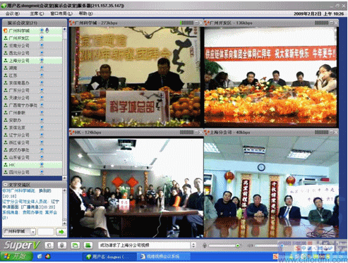 春節(jié)是中華民族的傳統(tǒng)的節(jié)日,尤其是跨國企業(yè)集團,身在海外的游子們,這一刻多么期待與在國內(nèi)的親人、朋友、以及同事網(wǎng)絡(luò)“面對面”的過春節(jié);因此,一些企業(yè)用視維視頻會議舉辦了別開生面的視頻拜年會。其中京信通信公司視頻年會尤為精彩,廣州科學(xué)城的主會場、廣州開發(fā)區(qū)、香港、北京、上海、西北分公司、武漢等20多個分公司通過視維視頻會議互拜大年,通過網(wǎng)絡(luò)視頻,遠隔千里一樣可以“面對面”的送上新春祝福。如下圖: