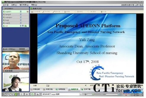 視維視頻會議系統(tǒng)良好的兼容性,使亞太地區(qū)各成員國的代表雖遠隔千山萬水,依然可以實現(xiàn)無限溝通。視維視頻會議系統(tǒng)所提供的清晰流暢的音視頻使各成員國的代表無需走出國門,無需聚到一起,就可以輕松地網(wǎng)絡(luò)面對面的進行交流,既可節(jié)約差旅費用,又可避免舟車勞頓之苦,是各國代表有更多精力投入到工作中;視維的共享白板、共享文檔、文件下載等強大的數(shù)據(jù)協(xié)作功能可以使各國代表快速地共享更多的信息、資料,及時地開展越洋培訓。近日網(wǎng)絡(luò)面對面地討論第三屆APEDNN的進程及各項議題就是一次典型的應用之一,不僅節(jié)約了差旅和時間成本,而且提高了工作效率,拉近世衛(wèi)各成員國之間的距離,天涯若比鄰,是各國代表在工作上更為默契,提高人類應對突發(fā)事件與災害的能力。