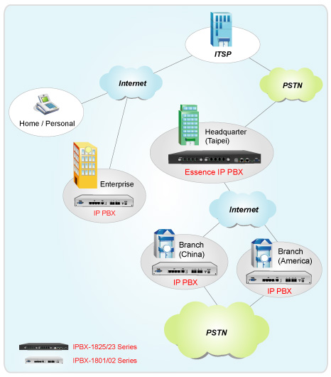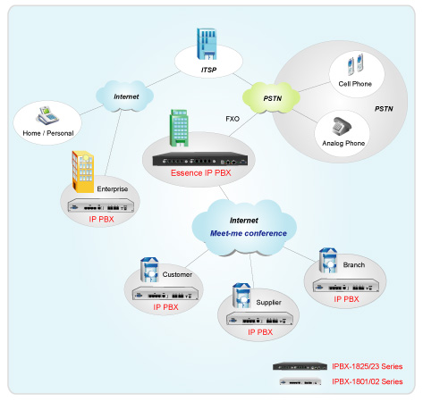 如圖所示,Essence IPBX 系列可透過內建之FXO或是ISDN接口與公共電話網(PSTN)或基于傳統(tǒng)PBX的企業(yè)電話網連接在一起。