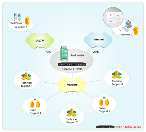 Essence IPBX系列可以注冊者之形式注冊于其他SIP協(xié)定伺服器上,如ITSP運營平臺,或是分公司之小型IP PBX注冊至總公司之大型IP PBX ,均可透過Internet 將話務無限延伸。