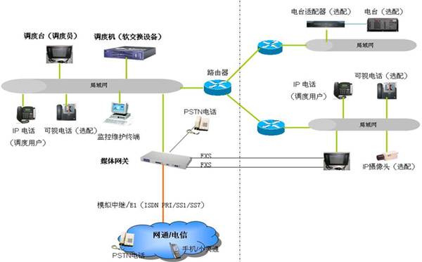 IP指揮調(diào)度語音通信系統(tǒng)由調(diào)度機、調(diào)度臺、媒體網(wǎng)關(guān)、IP電話、電臺適配器、電臺等設(shè)備組成,整體系統(tǒng)采用軟交換網(wǎng)絡的結(jié)構(gòu),構(gòu)建于以太網(wǎng)之上。傳輸網(wǎng)絡由通過路由器連接的多個局域網(wǎng)構(gòu)成;