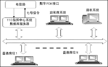 系統(tǒng)由以下部分組成:CTI服務(wù)器、接警席位系統(tǒng)、班長席位系統(tǒng)、局長席位系統(tǒng)。各部分系統(tǒng)可根據(jù)實際需求任意組合,各個部分充分考慮到開發(fā)的實用性、可靠性、先進(jìn)性和開放性,能夠?qū)④浖S護(hù)降到最小程度,這樣的設(shè)計可以讓用戶能夠改動硬件和數(shù)據(jù)庫,卻不用將軟件整體更換,保證了用戶的投資。其結(jié)構(gòu)如圖2所示。