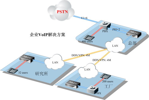 而目前網(wǎng)絡(luò)環(huán)境的改善,ADSL、寬帶的接入方式越來越普及,許多企業(yè)以及他們的分支機構(gòu)已經(jīng)通過各種方式接入Internet,鑒于Internet便宜的使用費用,廣泛的普及范圍,基于VPN/DDN的VOIP解決方案,徹底解決了上述問題,彌補了傳統(tǒng)電話網(wǎng)關(guān)的不足,且用戶可以根據(jù)自己需要,不斷擴(kuò)展IP語音端口,"邊發(fā)展邊升級",經(jīng)濟(jì)靈活,是一套性價比非常高的方案。