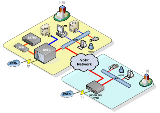 為了進一步拓展中國市場,并且針對某些特定的地方需要提供本地化方言服務,S公司需要在廣州設立一個新的座席集群,座席數量在50左右,需要擁有與中心點一樣完善的功能,實現呼叫的自由分配,共享中心點設施,比如CMS(呼叫中心報表系統)、IVR(交互式語音應答系統)和CDR(呼叫詳細記錄)等等。并提供最強的穩(wěn)定性和冗余備份功能。