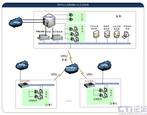 凱撒國(guó)旅分為北京總部、8個(gè)北京各門市部、上海分公司等。呼叫中心的建設(shè)方式分為總部集中建設(shè)和各門市點(diǎn)分布組網(wǎng)建設(shè)。中心總部采用的交換機(jī)和BasicCall CTI平臺(tái)構(gòu)建呼叫中心系統(tǒng),各個(gè)門市采用的是CrystalCall(CC水晶呼)呼叫中心產(chǎn)品。與傳統(tǒng)的建設(shè)呼叫中心的方式有所不同的是它實(shí)現(xiàn)了辦公與呼叫中心的融合以及各門市的聯(lián)網(wǎng),能夠更有效、更便捷的為客戶提供服務(wù)。