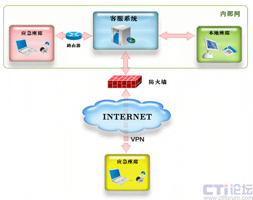 配置應(yīng)急座席的必要條件之一是網(wǎng)絡(luò)環(huán)境,要求應(yīng)急座席家庭計算機能夠連接到Internet或能夠直接訪問客服系統(tǒng)內(nèi)部網(wǎng)絡(luò),位于客服網(wǎng)絡(luò)防火墻之外需要通過相應(yīng)的技術(shù)連接到系統(tǒng),實現(xiàn)對系統(tǒng)的訪問。