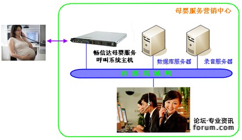 暢信達(dá)母嬰服務(wù)呼叫系統(tǒng)是以母嬰服務(wù)呼叫系統(tǒng)主機(jī)為呼叫交換和業(yè)務(wù)受理平臺(tái),選配數(shù)據(jù)庫服務(wù)器和錄音服務(wù)器,采用人工座席發(fā)起呼叫并接聽來電,系統(tǒng)架構(gòu)圖如下: