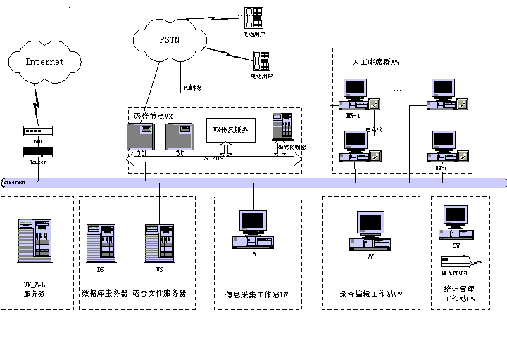 客戶服務(wù)中心系統(tǒng)包含智能排隊機(jī)(含接入服務(wù)器)、核心服務(wù)器CCS、交互式語音應(yīng)答系統(tǒng)IVR、語音傳真服務(wù)器、業(yè)務(wù)服務(wù)器、工作流服務(wù)器、數(shù)據(jù)庫服務(wù)器、Internet/Intranet服務(wù)器、人工座席、尋呼機(jī)接口,手機(jī)短消息接口等組成。如下圖所示為Runsun呼叫中心系統(tǒng)結(jié)構(gòu)圖: