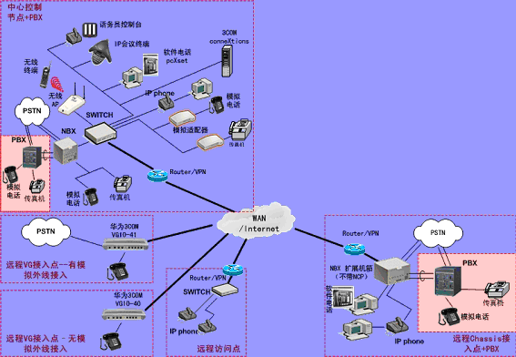 ③.遠(yuǎn)程接入的辦公室不再需要專用的 PBX, 只需要將3Com NBX電話終端接入到WAN網(wǎng)中,就能地實現(xiàn)在WAN或Internet上與3Com