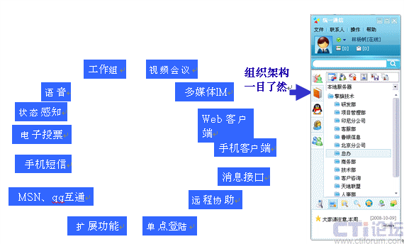 工作組:支持幾千級用戶同時(shí)在一個(gè)群組即時(shí)溝通,文件,IM,圖片支持。