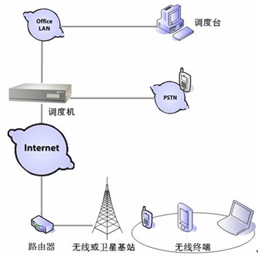 調度機通過有線網絡連接到各無線基站或衛(wèi)星地面站,利用原有的調度功能,可對各種無線終端進行調度。目前除了衛(wèi)星以外,還可利用WiFi、SCDMA等無線技術,根據使用范圍的大小來選擇不同的無線網絡。