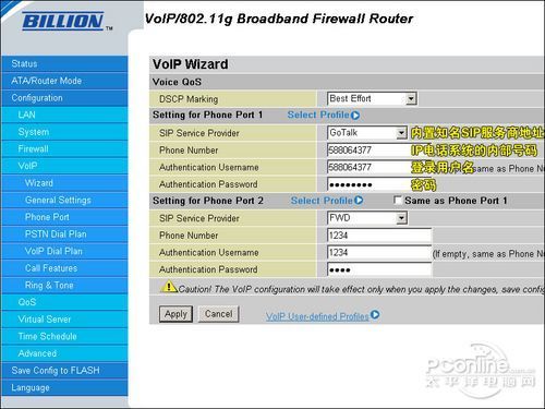 把申請得到的相關數(shù)據(jù)填入BiPAC 6404VGP中,在路由器后面接上電話就可以享受完全免費或超低價格的電話服務了。同一個SIP服務器下面的用戶互相撥打電話、收發(fā)傳真是免費的。