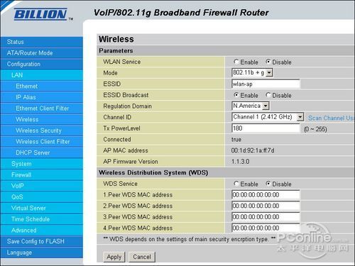 BiPAC 6404VGP的無線部分符合802.11b/g規(guī)范,最高無線速率可達54Mbps。無線部分的常規(guī)設置例如WIFI功能開關、SSID名稱自定義、SSID隱藏、信道選擇、WDS無線橋接等功能齊全。