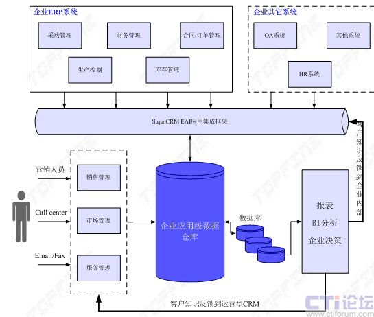 通方公司的SUPA CRM解決方案是一整套基于Web的企業(yè)級客戶關(guān)系管理系統(tǒng),是根據(jù)制造業(yè)的特點和發(fā)展趨勢為制造行業(yè)定制的應(yīng)用軟件。首先,它通過集成各種與客戶接觸的渠道,如Call Center 、Web 、Email 、Fax/Mail等,建立統(tǒng)一的與企業(yè)客戶互動的通訊平臺;其次,以此通訊平臺為基礎(chǔ),形成可定制化的業(yè)務(wù)流程管理,如銷售管理、市場管理、客戶服務(wù)管理與支持,處理與客戶相關(guān)的所有業(yè)務(wù),形成跨部門多功能的統(tǒng)一的業(yè)務(wù)處理平臺;最后,通過對客戶基本信息、客戶交易信息、客戶服務(wù)信息等的分析與挖掘,識別客戶消費規(guī)律和客戶價值,指導(dǎo)企業(yè)的部門運作和市場規(guī)劃,進(jìn)一步改善與客戶的互動關(guān)系,發(fā)現(xiàn)和捕捉更多的市場機會。