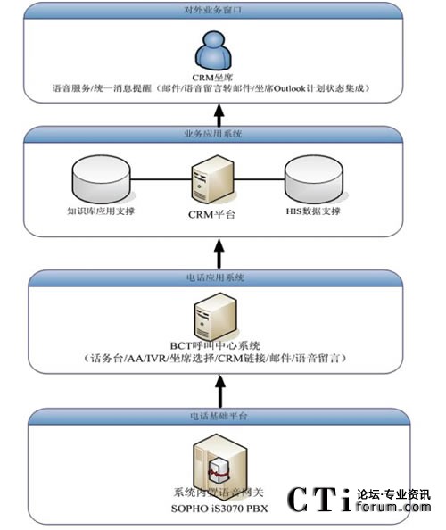 原先電話系統(tǒng)與CRM系統(tǒng)是獨立的兩個系統(tǒng),客服人員面對大量的客戶,迅速的獲悉來電客戶的身份、背景資料以及歷史資料在很大程度上決定了其服務(wù)質(zhì)量。BCT呼叫中心系統(tǒng)位于PBX與CRM之間,作為一個中間的橋梁,對PBX送來的電話信息或者用戶輸入的卡號等數(shù)據(jù)進(jìn)行處理分析,對主叫號碼或用戶輸入卡號進(jìn)行識別后,傳遞給CRM;CRM檢索與其相連的HIS(醫(yī)院信息系統(tǒng))的數(shù)據(jù)庫,將客戶資料以及相關(guān)的歷史記錄通過彈出網(wǎng)頁的模式,同步的顯示在坐席的計算機(jī)上,方便客服代表的輸入和后續(xù)操作,提高了效率與正確率。同時,客戶代表還可以在CRM頁面中點擊電話號碼,通過BCT發(fā)起電話呼叫來聯(lián)系客戶,來處理用戶回訪等工作。
