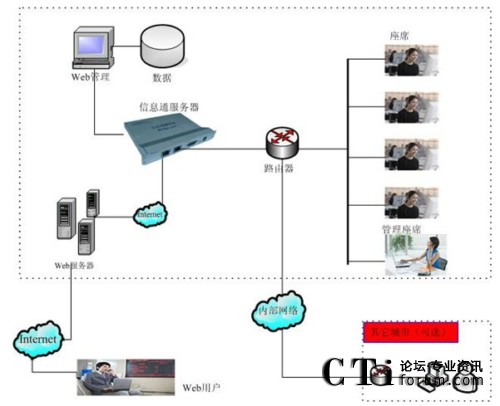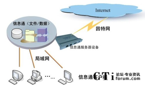 信息通系統(tǒng)的軟硬件部署,主要包括三個部分:信息通用戶工作平臺(客戶端)、信息通服務器(嵌入式設備)、數(shù)據(jù)/文件/管理服務器(其它應用)。其中,在實際應用中,信息通服務器與數(shù)據(jù)/文件服務器可以根據(jù)實際情況整合為一臺服務器。另外,整個系統(tǒng)通過應用網(wǎng)關(guān)——信息通服務器設備——與Internet連接,所以,信息通服務器與應用服務器為同一臺服務器。