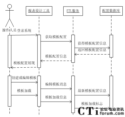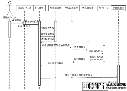 在ETL服務(wù)運行時,首先它會從配置數(shù)據(jù)庫中獲取模板的配置信息,并且根據(jù)其配置信息從ODS源數(shù)據(jù)庫中抽取數(shù)據(jù)。ODS源數(shù)據(jù)庫中的數(shù)據(jù)是狀態(tài)服務(wù)器從呼叫中心中獲得的。在ETL抽取數(shù)據(jù)后對其進行轉(zhuǎn)換和加工,將其加載到報表數(shù)據(jù)庫中。并利用報表展現(xiàn)工具將報表數(shù)據(jù)展現(xiàn)出來。其最終設(shè)計的系統(tǒng)各部件交互時序圖如圖3.5所示。
