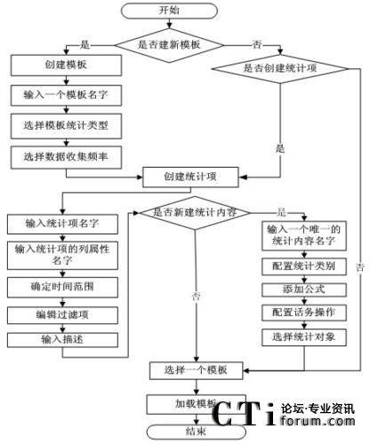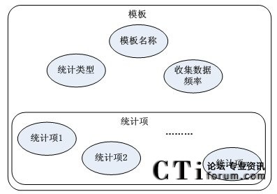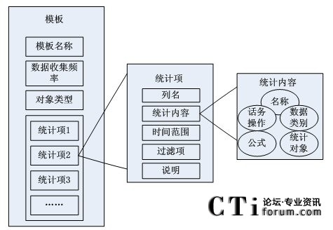 由模板結(jié)構(gòu)框架圖得知,模板包括模板名稱(chēng),數(shù)據(jù)統(tǒng)計(jì)對(duì)象,收集數(shù)據(jù)的頻率和多個(gè)基本統(tǒng)計(jì)項(xiàng)。其中,每個(gè)統(tǒng)計(jì)項(xiàng)對(duì)應(yīng)著統(tǒng)計(jì)對(duì)象(如:坐席,路由點(diǎn)等)的一條統(tǒng)計(jì)內(nèi)容信息(如:1小時(shí)內(nèi)的呼叫總量等)。然后由這些統(tǒng)計(jì)項(xiàng)和統(tǒng)計(jì)參數(shù)組合成模板,從而構(gòu)成對(duì)呼叫中心對(duì)象的統(tǒng)計(jì)信息。
