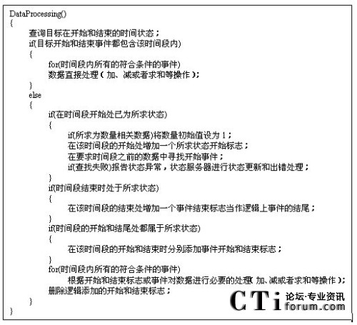 根據(jù)報(bào)表數(shù)據(jù)處理流程,系統(tǒng)需要靈活處理數(shù)據(jù)庫(kù)中存儲(chǔ)的話務(wù)消息,以滿(mǎn)足使用者的具體需求。但有時(shí)系統(tǒng)還需要對(duì)某些邏輯數(shù)據(jù)進(jìn)行特殊的處理,以使其符合用戶(hù)需求。如要收集固定時(shí)間段內(nèi)的呼叫總時(shí)間,可能會(huì)出現(xiàn)該時(shí)間段內(nèi)沒(méi)有該呼叫的開(kāi)始事件,或者無(wú)該呼叫的結(jié)束事件等的情況,所以系統(tǒng)就需要對(duì)話路的操作事件進(jìn)行一定的算法處理。