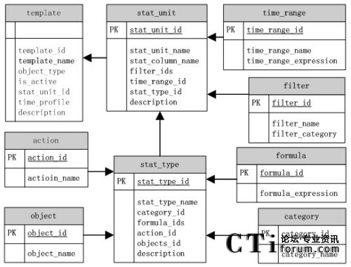 在模板配置存儲(chǔ)模型圖中,分別建立了單獨(dú)的表對(duì)模板劃分的每一個(gè)基本對(duì)象進(jìn)行儲(chǔ)存。表template存儲(chǔ)模板的配置信息,stat_unit表存儲(chǔ)了統(tǒng)計(jì)項(xiàng)的基本信息,stat_type表是一些有關(guān)模板具體內(nèi)容的配置。各表之間通過(guò)各自的ID標(biāo)識(shí)號(hào)來(lái)進(jìn)行關(guān)聯(lián)。不過(guò)一個(gè)模板可以包括多個(gè)統(tǒng)計(jì)單元,一個(gè)統(tǒng)計(jì)項(xiàng)可以包含多個(gè)過(guò)濾項(xiàng),一個(gè)統(tǒng)計(jì)內(nèi)容可以包含多個(gè)公式,這樣他們之間的ID關(guān)聯(lián)就成為1對(duì)多的關(guān)系。在這種情況下,父項(xiàng)中的ID關(guān)聯(lián)多個(gè)子項(xiàng)ID,其間是用逗號(hào)分隔。