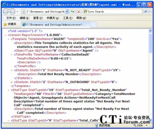 在模板導(dǎo)出的XML儲(chǔ)存圖中,ReportVersion屬性為報(bào)表系統(tǒng)的版本號(hào)。Template信息用來(lái)指定一個(gè)模板名字,給模板一個(gè)唯一的模板ID,再指定該模板是否激活,另外也為該模板添加了注釋。該例中是對(duì)所有坐席活動(dòng)的數(shù)據(jù)進(jìn)行統(tǒng)計(jì)。ObjectType為模板的統(tǒng)計(jì)類(lèi)型,該模板中統(tǒng)計(jì)類(lèi)型為坐席(Agent)。TimeProfile為設(shè)定收集的時(shí)間間隔,本例中為從每天的0點(diǎn)0分開(kāi)始,每隔15分鐘收集一次。Statistic對(duì)應(yīng)了一個(gè)統(tǒng)計(jì)內(nèi)容配置,根據(jù)StatTypeID在下面將列出詳細(xì)內(nèi)容。本例中StatTypeID為19,下面的StatType中將會(huì)根據(jù)StatTypeID與之相對(duì)應(yīng),其中配置了Category, Objects ,Actions, TimeRange, Filter以及該StatType的注釋。