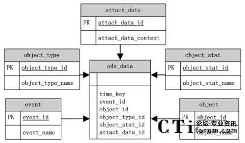 根據(jù)ODS源數(shù)據(jù)庫(kù)模型圖,ods_data表中存儲(chǔ)了事件發(fā)送的時(shí)間(time_key)、事件(event)、報(bào)表統(tǒng)計(jì)對(duì)象(object)、對(duì)象狀態(tài)(object_stat)、對(duì)象類(lèi)型(object_type)以及一些隨路數(shù)據(jù)(attach_data)等信息。這些對(duì)象的詳細(xì)信息都是以各部分的ID來(lái)對(duì)內(nèi)容進(jìn)行關(guān)聯(lián)。