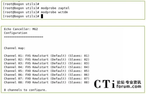 上面的輸出表示A1200P的通道都已識(shí)別,驅(qū)動(dòng)安裝成功(本文用的是8個(gè)FXS口,上面的channel 01到channel 08是FXs口,后面的FXO表示它們使用的是FXO的信令,并不是表示它們是FXO口,這一點(diǎn)大家應(yīng)該注意)