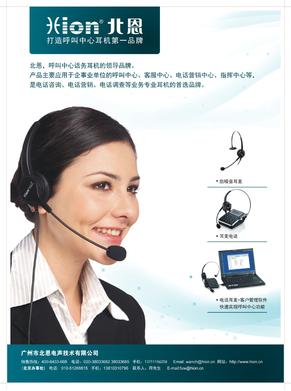 目前北恩Hion耳機品牌已覆蓋全球市場,在北京、上海、廣州、深圳、鄭州、南京設有售后服務中心,并在北美、歐洲、南亞等擁有核心合作伙伴。產(chǎn)品主要應用于電信、金融、電視購物、物流等客服中心以及總機接線員、指揮中心、呼叫中心等,是電話咨詢、電話營銷、電話調查等業(yè)務專業(yè)耳機首選產(chǎn)品。北恩采用最先進耳機生產(chǎn)技術,制造世界一流的通信耳機,全力打造呼叫中心話務耳機第一品牌。