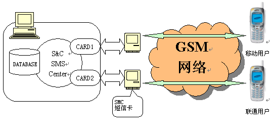 采用短信卡方式的短信系統(tǒng)結(jié)構(gòu)如下圖,短消息通過(guò)內(nèi)置PCI短信卡發(fā)送,通過(guò)靈活多變的接口,與其他系統(tǒng)集成,組成短信應(yīng)用系統(tǒng)。