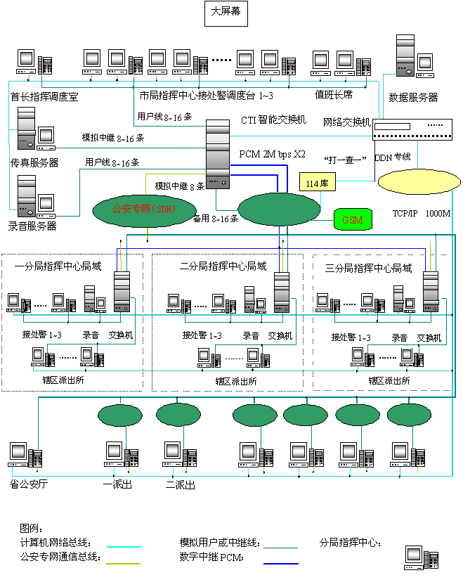 - 樹立大網(wǎng)絡概念:采用先進的通訊、計算機網(wǎng)絡技術(shù)(采用CTI可編程交換技術(shù)),利用現(xiàn)有的通信資源,實現(xiàn)市局指揮中心與消防大隊、交警大隊、各派出所的計算機網(wǎng)絡及相關(guān)領導辦公室計算機大聯(lián)網(wǎng);形成全市范圍內(nèi)110、119、122有線、無線全方位立體調(diào)度語音通道大網(wǎng)。