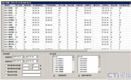 “系統(tǒng)”平臺可實(shí)現(xiàn)對整個(gè)電話咨詢的實(shí)時(shí)監(jiān)控,可以獲得任意一段時(shí)間內(nèi)中繼線的使用情況、座席的使用情況及工作狀態(tài)、進(jìn)出隊(duì)列等,通過多種圖示、詳細(xì)數(shù)據(jù)報(bào)表,可以找出一天、一周或一個(gè)月內(nèi)呼入總量、瞬間呼入峰值、呼入量分布特點(diǎn)等,從而合理地系統(tǒng)資源和值班人員,在緊急時(shí)間可適當(dāng)?shù)卦鰷p中繼線、座席、IVR端口的數(shù)量,確保系統(tǒng)運(yùn)行最為經(jīng)濟(jì),合理;還可以通過座席員接打電話情況報(bào)表,對座席員進(jìn)行科學(xué)的考評。
