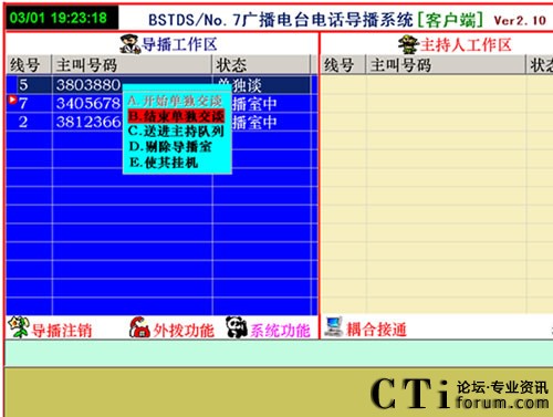 如想接聽哪個(gè)電話號(hào)碼,用右鍵點(diǎn)擊這個(gè)號(hào)碼會(huì)出現(xiàn)菜單,在菜單中只有三種命令可以選擇“單獨(dú)交談”“剔除導(dǎo)播室”“使其掛機(jī)”。點(diǎn)擊“開始單獨(dú)交談”后拿起電話聽筒,這時(shí)導(dǎo)播可以單獨(dú)同參與者通話了,其他參與者聽不到交談,只能聽到音樂聲,導(dǎo)播問明參與者參與內(nèi)容后須接入直播間的,應(yīng)按“結(jié)束單獨(dú)交談”后點(diǎn)擊“送到主持列隊(duì)”送到主持人區(qū)等待主持人同參與者交談。