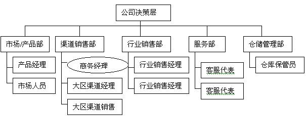 除分銷渠道管理之外,紫光網(wǎng)聯(lián)的前端管理組織機構還包括市場/產(chǎn)品部、行業(yè)銷售部、服務部和倉儲管理部門。示意圖如下: