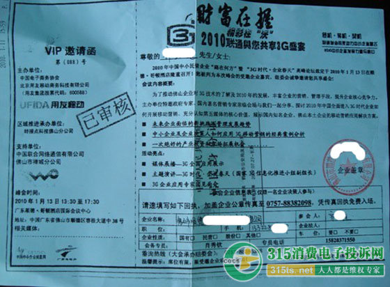 前不久,齊先生接到一個自稱中國聯(lián)通客服負責人的電話,邀他參加“3G經(jīng)濟高峰論壇”。起初他并不相信,但對方發(fā)來的“財富在握”的邀請函上,顯要位置確實打著“精彩在沃,聯(lián)通與您共享3G盛宴”的字樣,并且支持單位也是“中國聯(lián)合通信網(wǎng)絡有限公司佛山市禪城分公司”(詳見下圖)。一想到中國聯(lián)通是國企,也是大公司,值得依賴,再加上自己是聯(lián)通公司十幾年的老用戶,所以未加多想就答應參加了。