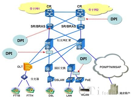 用戶身份的識(shí)別可以通過(guò)傳統(tǒng)的PPPoE和IPoE協(xié)議部分實(shí)現(xiàn),為了解終端類型、地理位置等信息,可對(duì)上述協(xié)議進(jìn)行擴(kuò)展或引入新的協(xié)議支持;對(duì)于業(yè)務(wù)類型的識(shí)別,業(yè)界普遍認(rèn)為應(yīng)通過(guò)引入深度包檢測(cè)DPI(Deep Packet Inspection)技術(shù)來(lái)實(shí)現(xiàn)。DPI設(shè)備可以多種形態(tài)和多種方式部署在網(wǎng)絡(luò)接入層或匯聚層,例如與PTN設(shè)備、城域網(wǎng)的BRAS或SR共框,或者獨(dú)立部署。