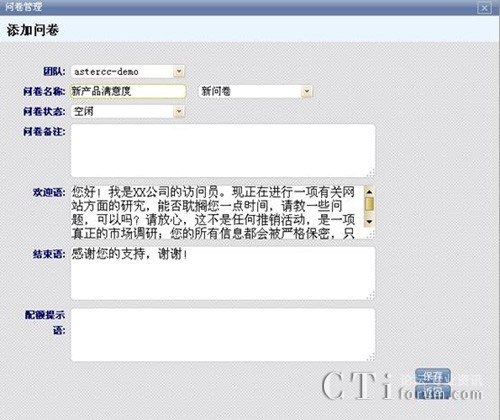 添加功能用來添加新問卷,這里你可以根據(jù)業(yè)務(wù)的需要設(shè)定所需要得信息,例如問卷的歡迎語,結(jié)束語,配額提示語等信息,自定義輸入信息。