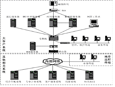 DW/OLAP服務器具有數(shù)據(jù)的采集、分析等功能,通信服務器主要實現(xiàn)大客戶管理系統(tǒng)與外部系統(tǒng)的接口及轉(zhuǎn)換,Web服務器則支持軟件B/S模式的實現(xiàn)。其它設備則包括網(wǎng)管工作站(如:HP