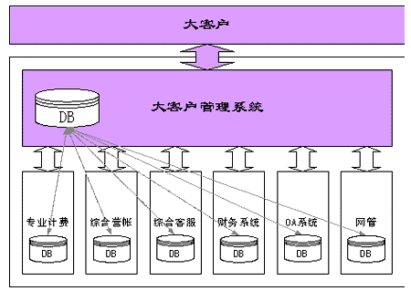 電信企業(yè)大客戶管理系統(tǒng)是電信企業(yè)信息系統(tǒng)中的一個組成部分,與其它業(yè)務系統(tǒng)如大客戶服務系統(tǒng)、綜合營帳、財務系統(tǒng)、計費系統(tǒng)、OA系統(tǒng)、網(wǎng)管系統(tǒng)等都有著不可分割的聯(lián)系,它需要從這些系統(tǒng)中提取相應的數(shù)據(jù)并且把相應的數(shù)據(jù)傳輸?shù)狡渌到y(tǒng),或者和這些系統(tǒng)一起完成系統(tǒng)的某些重要功能,如合同跟蹤等。而且大客戶管理系統(tǒng)也會極大影響各個業(yè)務系統(tǒng)的運行,大客戶系統(tǒng)與相關系統(tǒng)之間的關系如下圖所示: