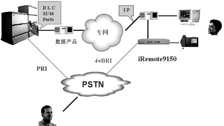 在iRemote遠端坐席實現(xiàn)方式中,系統(tǒng)采用的遠端語音模塊iRemote9150由安裝在M1內(nèi)的MIG RLC卡板和遠端單元iRemote9150組成。MIG RLC卡板通過10BASE-T以太網(wǎng)接口與路由器相連。iRemote單元既可通過10BASE-T以太網(wǎng)接口與路由器相連,也可以以ISDN BRI方式與PSTN相連,每個遠端單元最多提供4個BRI接口,32個數(shù)字話機接口,一個用于傳真的模擬端口。每塊MIG RLC卡板有一DSP模塊,可同時處理8路語音,通過在MIGLC板上增加3塊DSP模塊,最多可同時處理32路話音。IP網(wǎng)上的話音符合UDP/IP協(xié)議,話機狀態(tài)控制信號符合TCP/IP協(xié)議。同一遠端單元間的兩用戶通話無需占用M1帶寬。